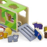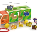 Le camion se tire à l’aide d’une ficelle et sert aussi de boîte à formes astucieuse. Les enfants mobilisent mouvement et logique en cherchant les bonnes ouvertures pour les animaux.