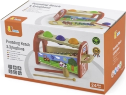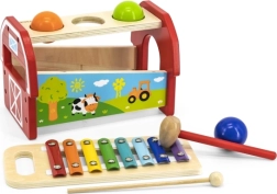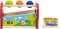 - base avec réceptacle pour billes, xylophone, marteau en bois, 3 billes colorées