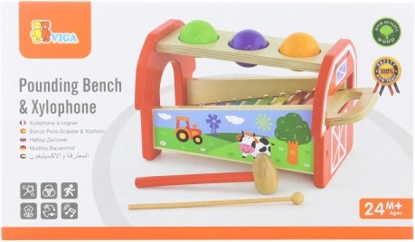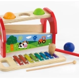 base avec réceptacle pour billes, xylophone, marteau en bois, 3 billes colorées