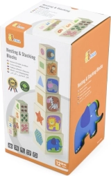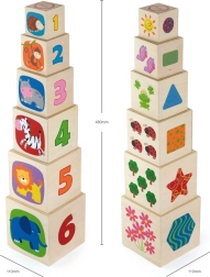 L’ensemble comprend 6 cubes en bois solides de tailles différentes, permettant aux enfants de construire une tour stable ou de les emboîter les uns dans les autres. Les illustrations riches avec des animaux, des couleurs, des formes et des quantités favorisent les premiers apprentissages et enrichissent le vocabulaire.