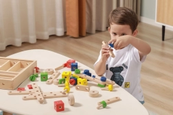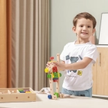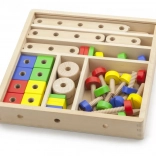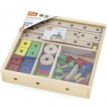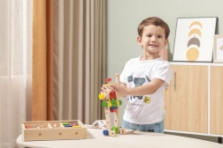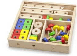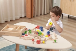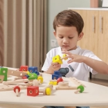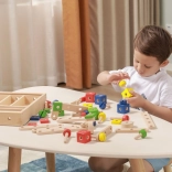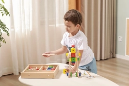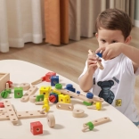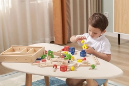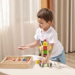 La construction développe la motricité fine, la coordination œil-main ainsi que la pensée logique et spatiale. Le bois naturel associé à des couleurs vives invite au jeu et à l’apprentissage par le plaisir. Tout est rangé de manière ordonnée dans une boîte avec couvercle transparent pour un rangement facile et des pièces toujours à portée de main.