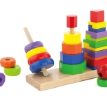 Les formes et couleurs variées des pièces en bois apprennent aux enfants à reconnaître et nommer les formes et les couleurs.