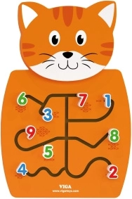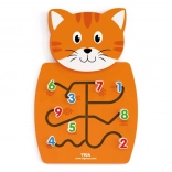 Chat en bois avec des labyrinthes pour déplacer les chiffres et développer la motricité fine.