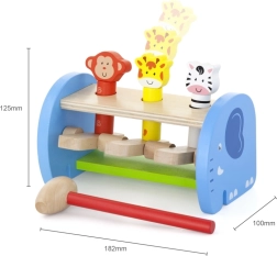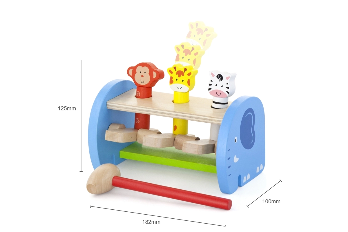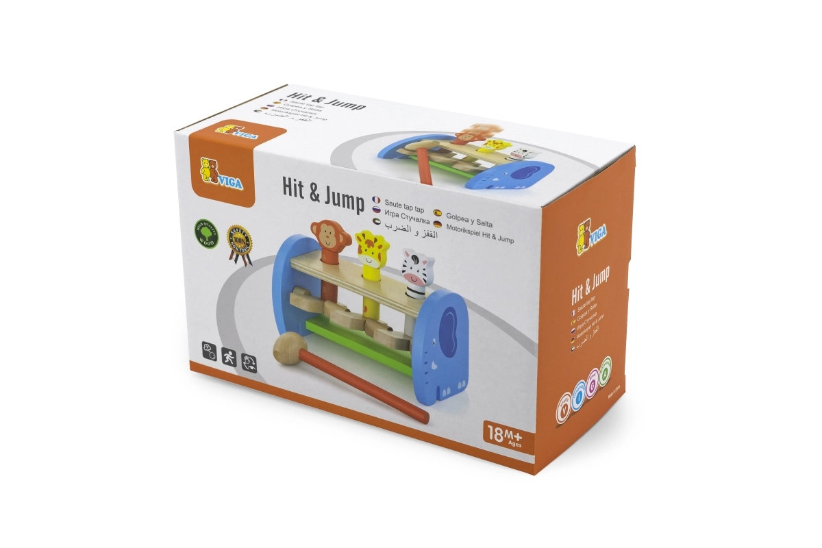 Ce jouet en bois de qualité offre un jeu sûr et coloré avec de mignons animaux. À l’aide du marteau, les enfants tapotent sur le mécanisme qui fait jaillir les animaux – ils perfectionnent ainsi leur prise, la force de leur poigne et la précision du mouvement. La construction solide et les bords lisses garantissent la sécurité lors d’une utilisation quotidienne.