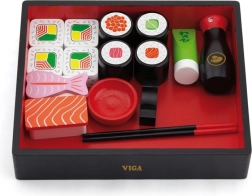 L'ensemble comprend divers morceaux de sushi en bois, des baguettes, un récipient pour sauce soja et un plateau de service, reproduisant parfaitement l'expérience authentique de la présentation de sushi. C'est un excellent moyen de faire découvrir aux enfants différents types de nourriture et de leur enseigner les compétences de base de la cuisine japonaise.
