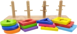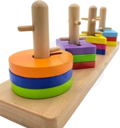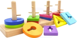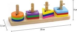 En assemblant différentes formes sur des tiges en bois, le jouet favorise le développement de la motricité fine et de la coordination œil-main.