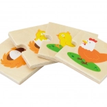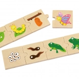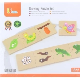Ce set de puzzles « évolutifs » en bois apprend aux enfants à comprendre les cycles de vie des animaux et des plantes – de la graine ou de l’œuf jusqu’à l’âge adulte. Chaque motif est une séquence de pièces qui s’emboîtent logiquement et aident à entraîner naturellement la motricité fine, la compréhension des relations et la coordination œil–main.