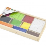 Les réglettes sont en bois verni et colorées avec des peintures sûres. Une boîte en bois robuste avec compartiments garde tout à sa place et facilite le rangement après le jeu.