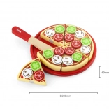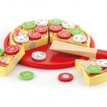 La pizza est divisée en parts et accompagnée d'une spatule/d'un petit couteau, pour que les enfants puissent couper et servir comme dans une vraie pizzeria.