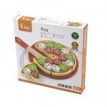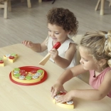 Différents toppings en bois (p. ex. champignons, poivrons, tomates) stimulent l'imagination et l'apprentissage des couleurs et des formes.