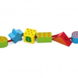 Ce set d’enfilage en bois offre aux enfants d’innombrables possibilités de création : enfiler comme des perles, construire des tours et des petites maisons, ou trier par couleurs et par formes. Les grandes pièces (env. 4 cm) sont faciles à tenir et idéales pour les premiers exercices moteurs.