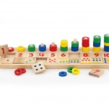 Le jouet est fabriqué en bois écologique, garantissant la sécurité et une agréable sensation au toucher. Grâce aux plaquettes facilement amovibles avec des chiffres, les enfants peuvent également apprendre des tâches mathématiques simples comme l'addition et la soustraction.