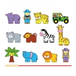 Le set comprend des blocs en bois représentant les habitants du safari, dont un léopard, un palmier, un singe, un hippopotame, un zèbre, une jeep, une girafe, un ours, un lion, un éléphant et un guide. Les blocs sont soigneusement peints des deux côtés avec des peintures non toxiques et procurent beaucoup de plaisir lors du jeu. Tous les éléments sont conçus pour soutenir le développement de la motricité fine et la connaissance du monde animal.