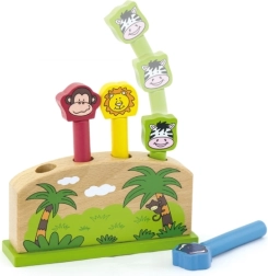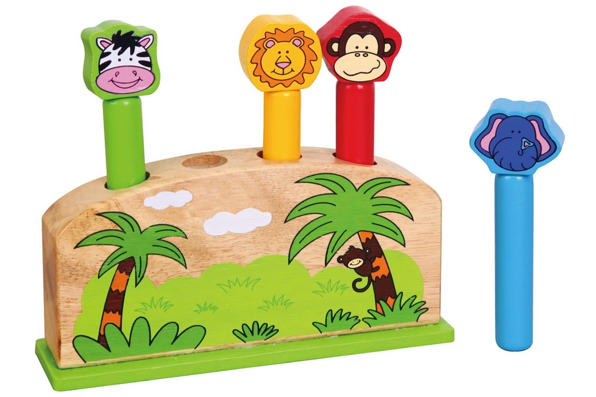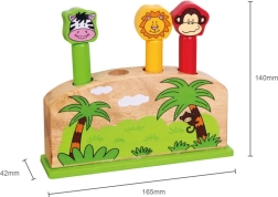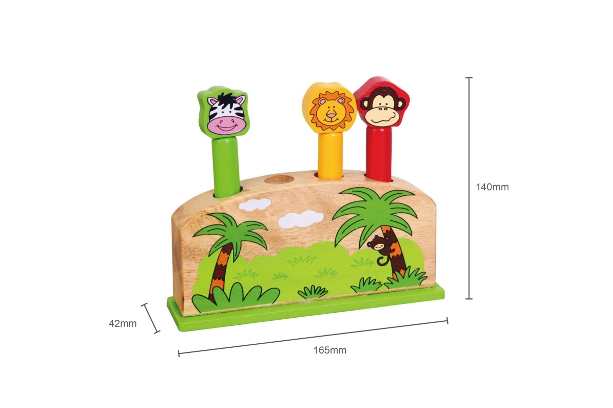 Ce jeu pop-up en bois avec animaux est un premier jouet moteur idéal. Les enfants insèrent les chevilles-animaux dans les trous et, après avoir pressé le ressort, les figurines jaillissent de façon ludique. La base en bois robuste au motif jungle et les animaux amicaux encouragent le jeu répété et développent la patience ainsi que la concentration.