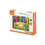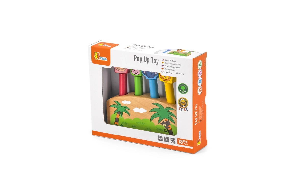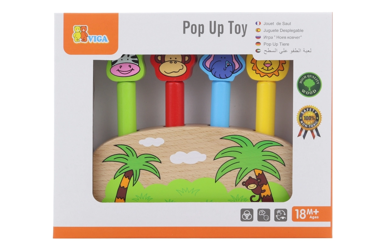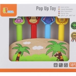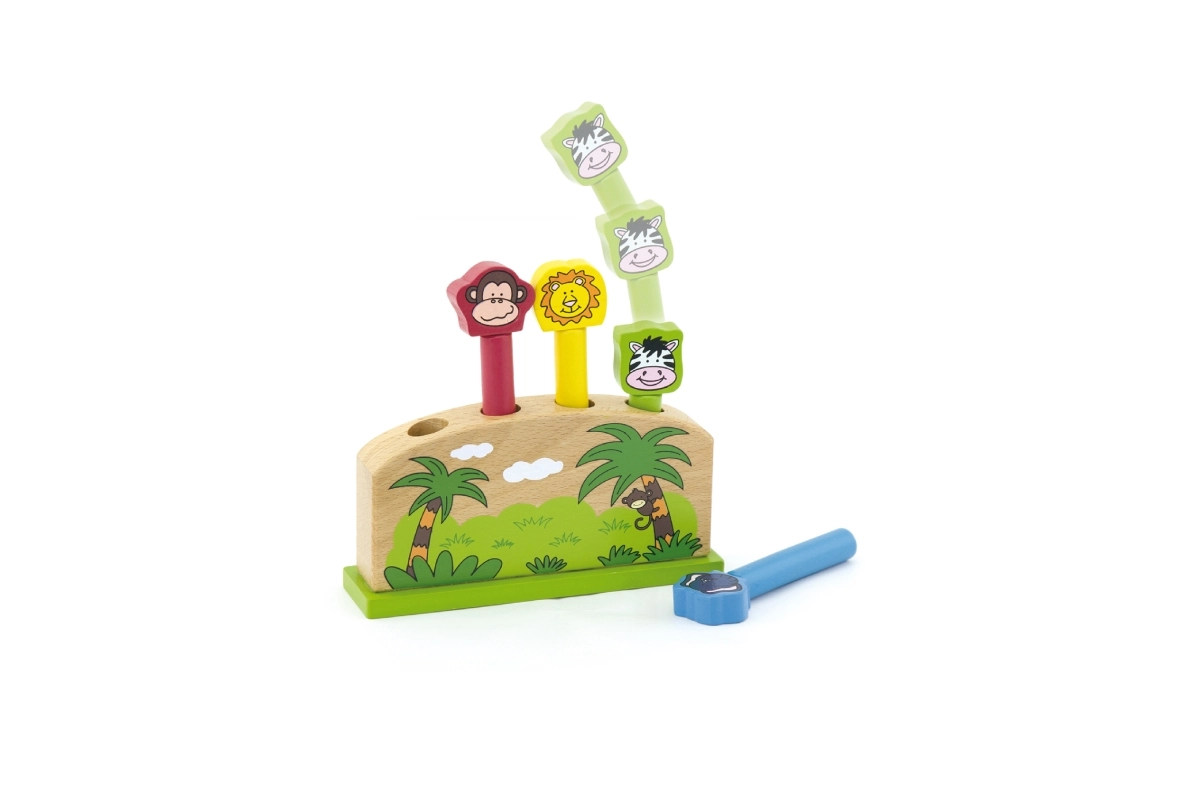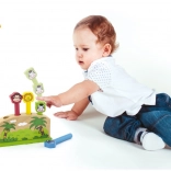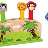 Un jeu en bois amusant pour les tout-petits où, en appuyant sur les chevilles colorées avec des animaux, les figurines sautent joyeusement. Favorise la motricité fine, la coordination œil-main et le jeu curieux dès 18 mois.