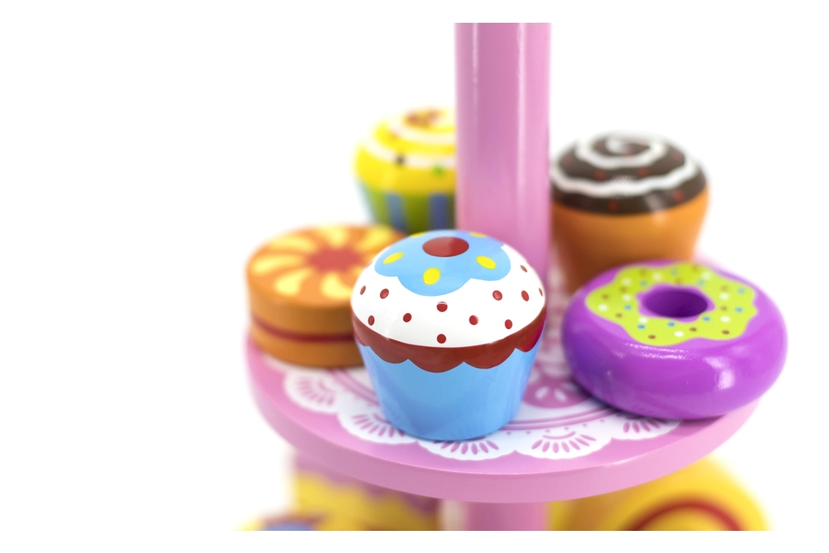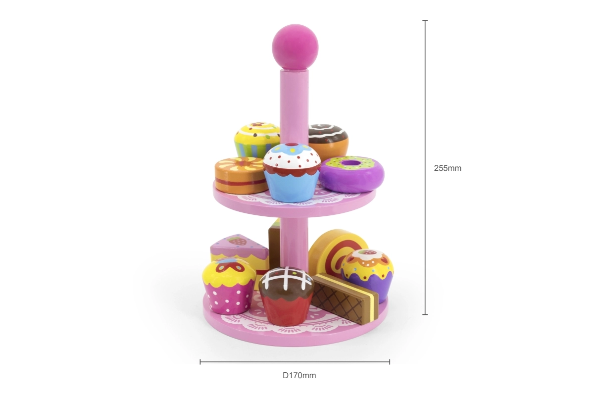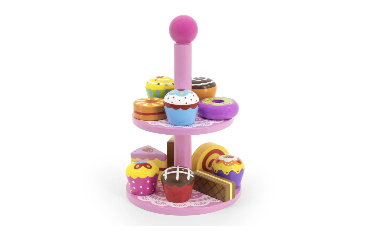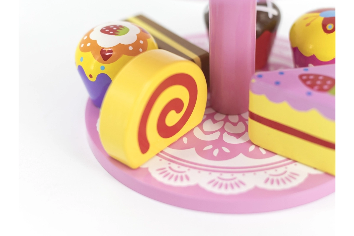 Ce set élégant de desserts en bois sur un présentoir à deux niveaux est idéal pour jouer au café, au goûter ou à la pâtisserie des enfants. Les pièces en bois de qualité, aux couleurs vives, invitent à l’exploration et développent la coordination œil-main.