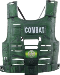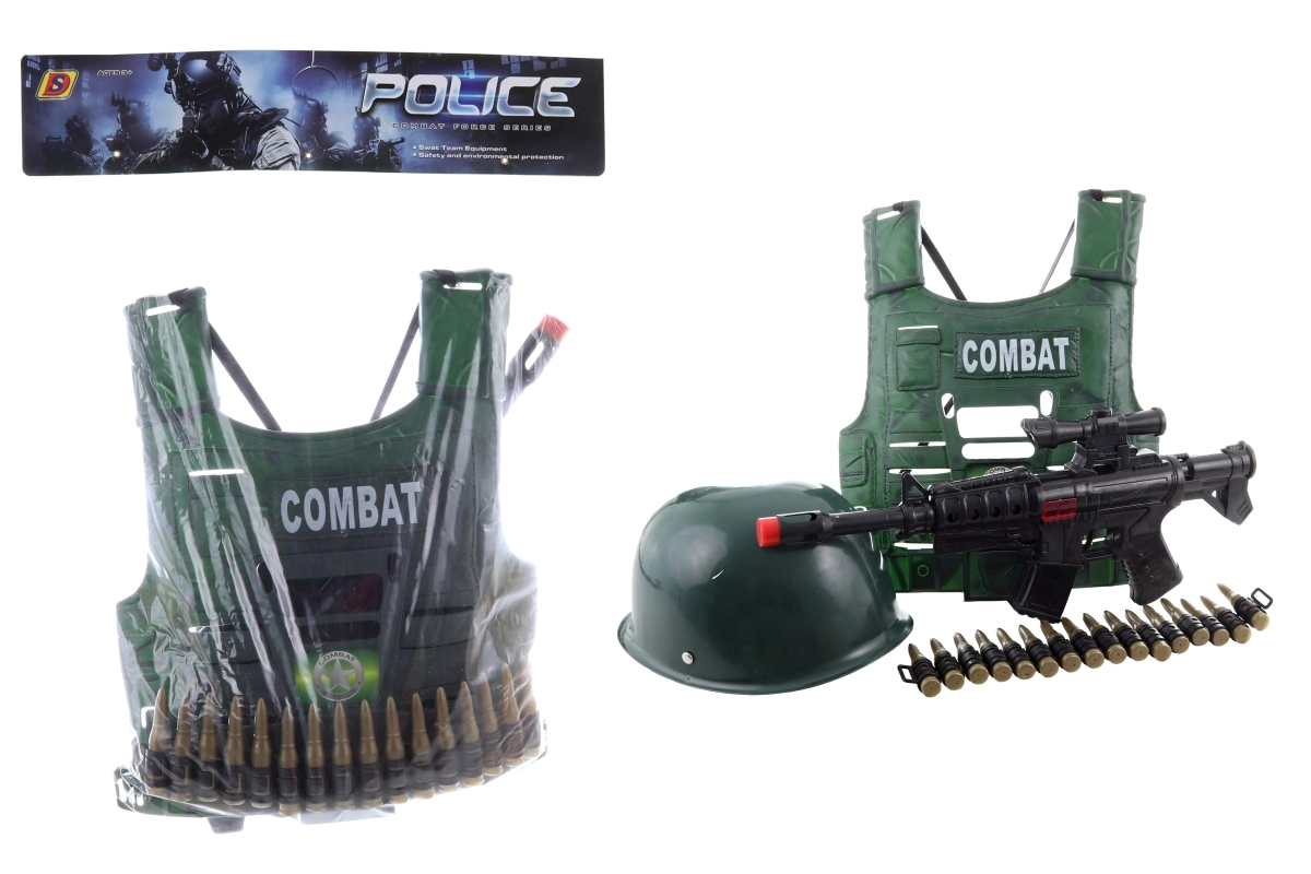 - Casque, gilet en plastique avec élastiques, fusil mitrailleur en plastique, balles