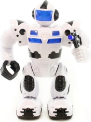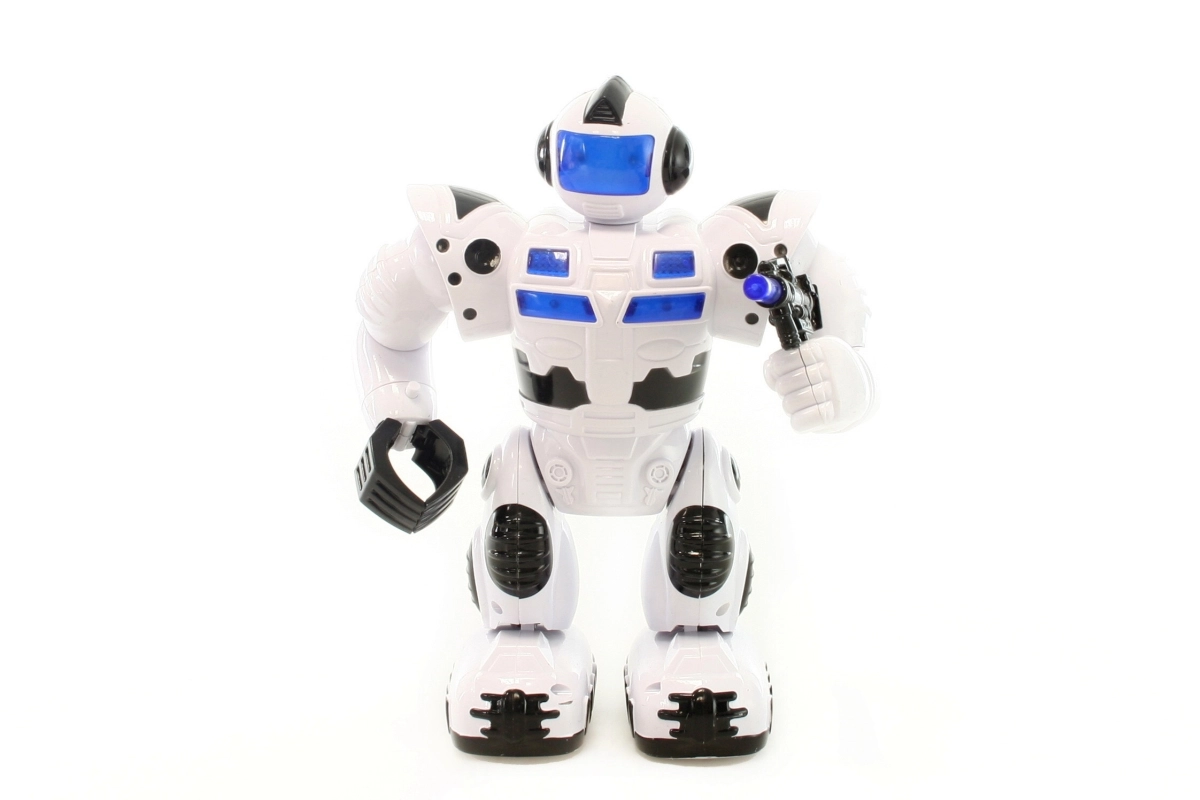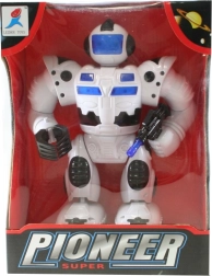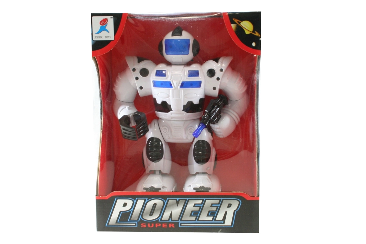 Robot à piles qui marche, s’illumine et émet des sons, avec mouvements des bras et de la tête. Alimentation par 4 piles AA (non incluses). Taille du robot env. 23 × 17 cm. Âge 3+
