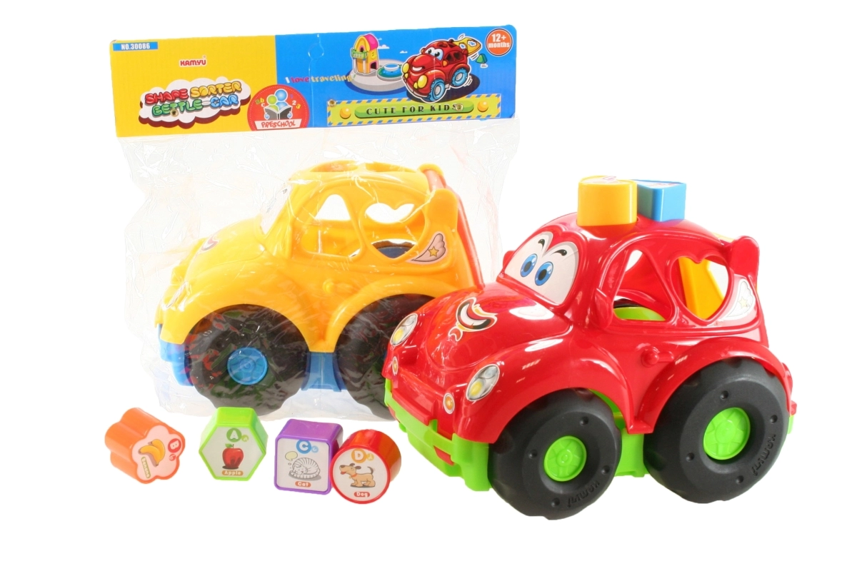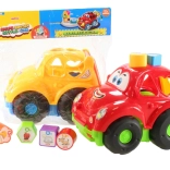 Voiture en plastique joyeuse avec formes à encastrer. Taille de la voiture env. 22 cm. Contient 6 blocs à encastrer avec des lettres et des images. Âge 12 mois et plus