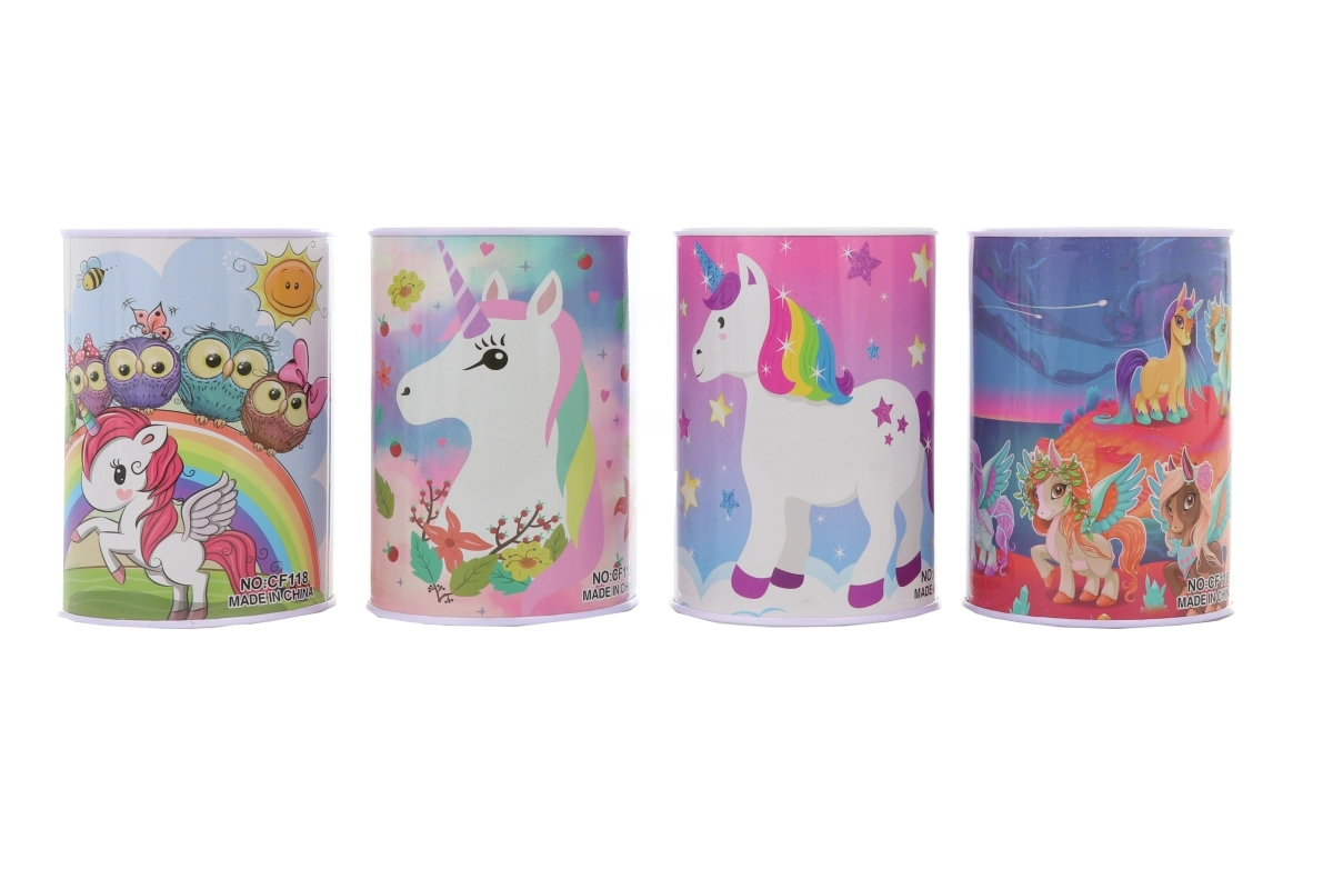 Cette tirelire en tôle avec un motif de licornes féerique est parfaite pour développer de bonnes habitudes financières chez les enfants. La conception métallique robuste résiste à une utilisation quotidienne et, grâce à ses dimensions compactes, elle trouve sa place sur une étagère ou un bureau.
