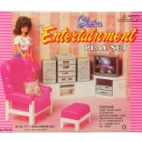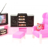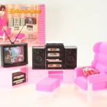 L’ensemble est fabriqué en plastique robuste et comprend un fauteuil confortable avec repose-pieds, un mur de salon avec portes, un meuble d’angle et un équipement multimédia. Les dimensions compactes de chaque élément facilitent la manipulation et le rangement.
