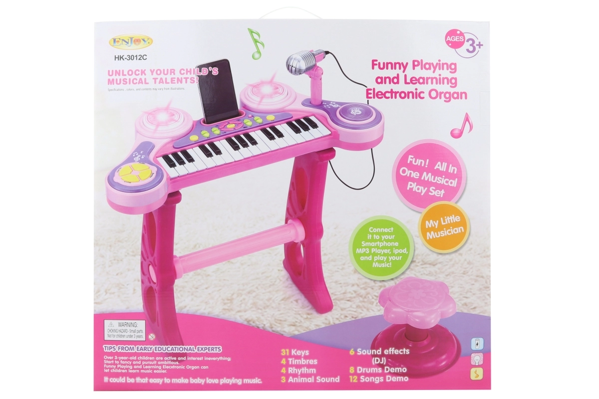 Grâce à ses fonctions intégrées, les enfants peuvent choisir différentes mélodies d’accompagnement, changer d’instruments et chanter au microphone. La connexion à un lecteur MP3 permet de lire des morceaux favoris pour jouer et chanter dessus.