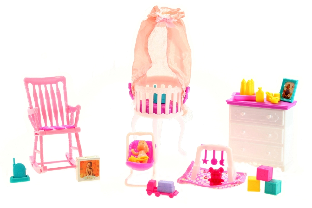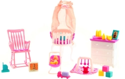 - Équipement complet : commode, berceau à baldaquin, transat, fauteuil à bascule, jouets et accessoires pour bébé.