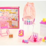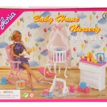 Le coffret complet pour bébé de la marque Glorie apporte tout ce qu’il faut à la chambre d’enfant pour jouer avec des poupées. Il comprend une commode avec tiroir, un berceau à baldaquin, un transat, un fauteuil à bascule, des accessoires de soin pour bébé et le bébé lui‑même. Idéal dès 3 ans pour développer l’imagination et les compétences de soin.
