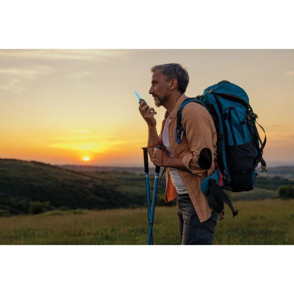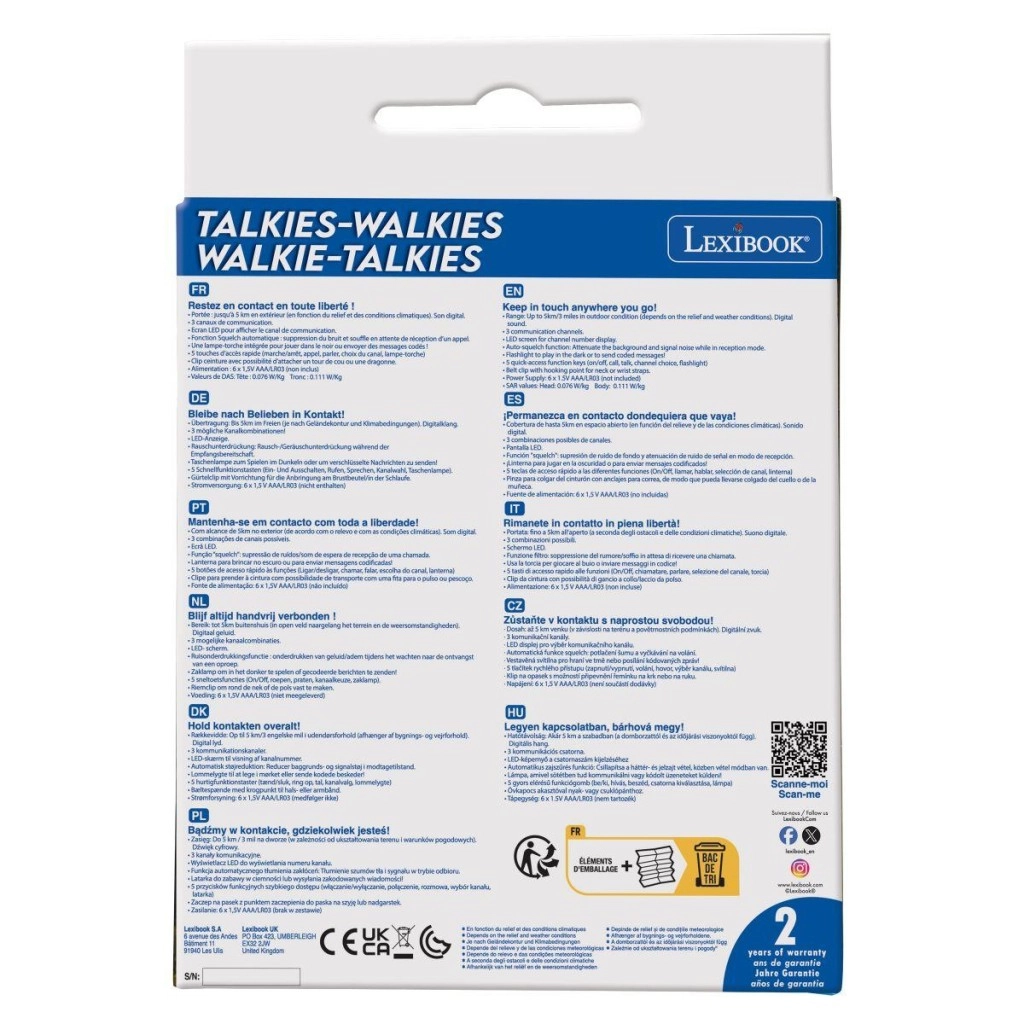 - 6× AAA/LR03 (1,5 V) – 3 piles par talkie-walkie (non incluses)