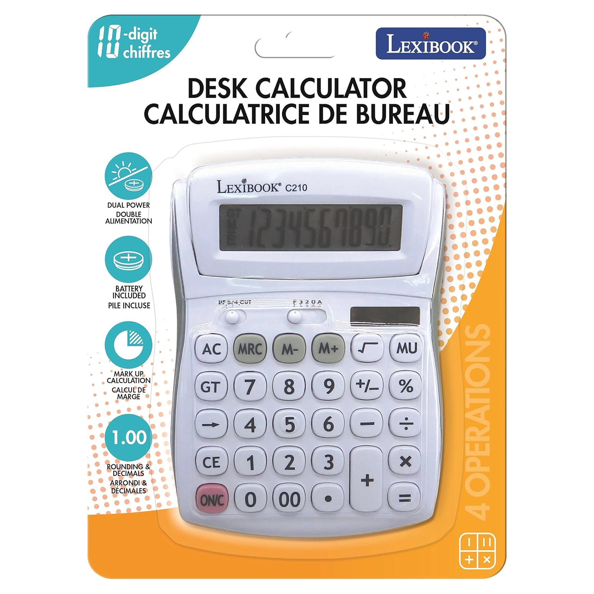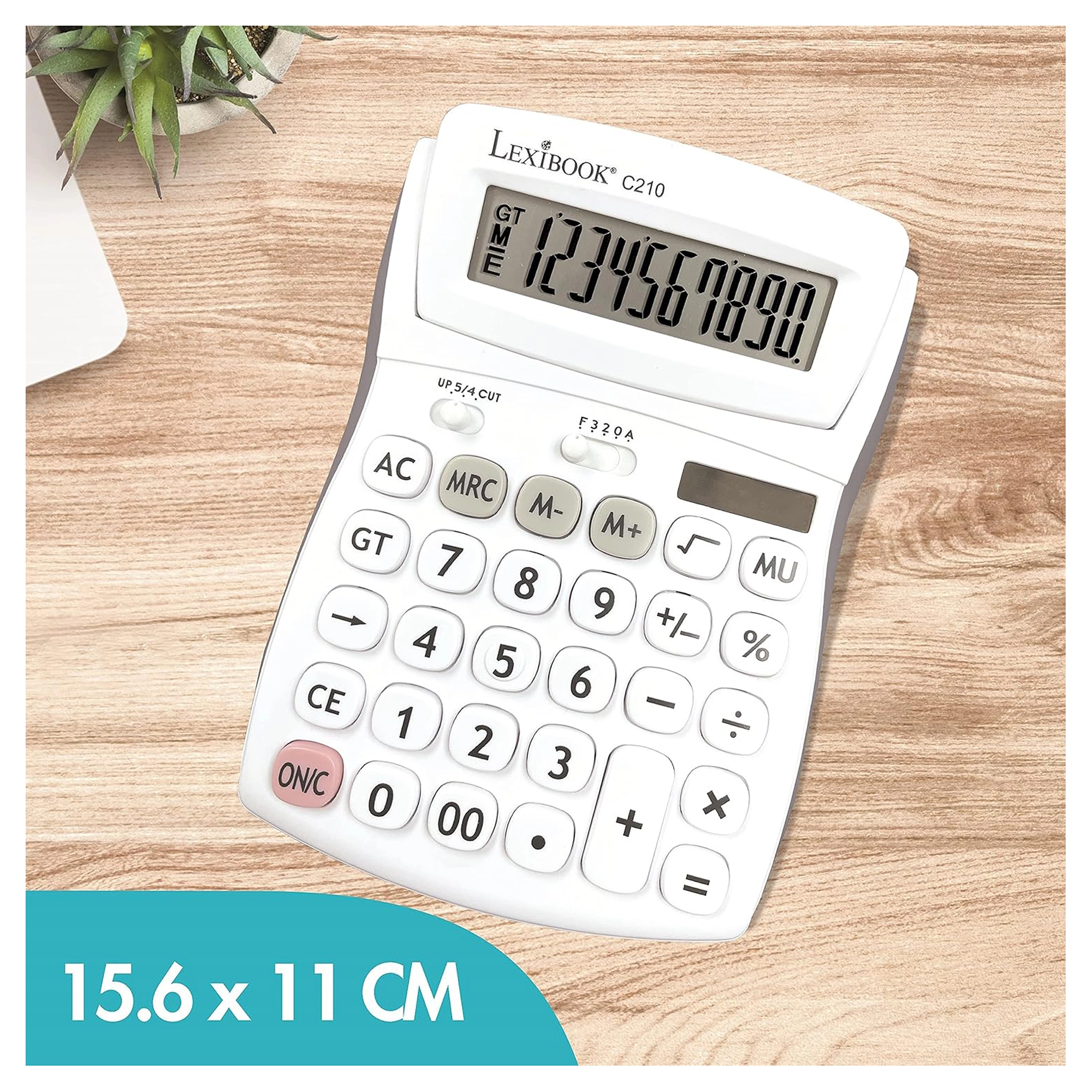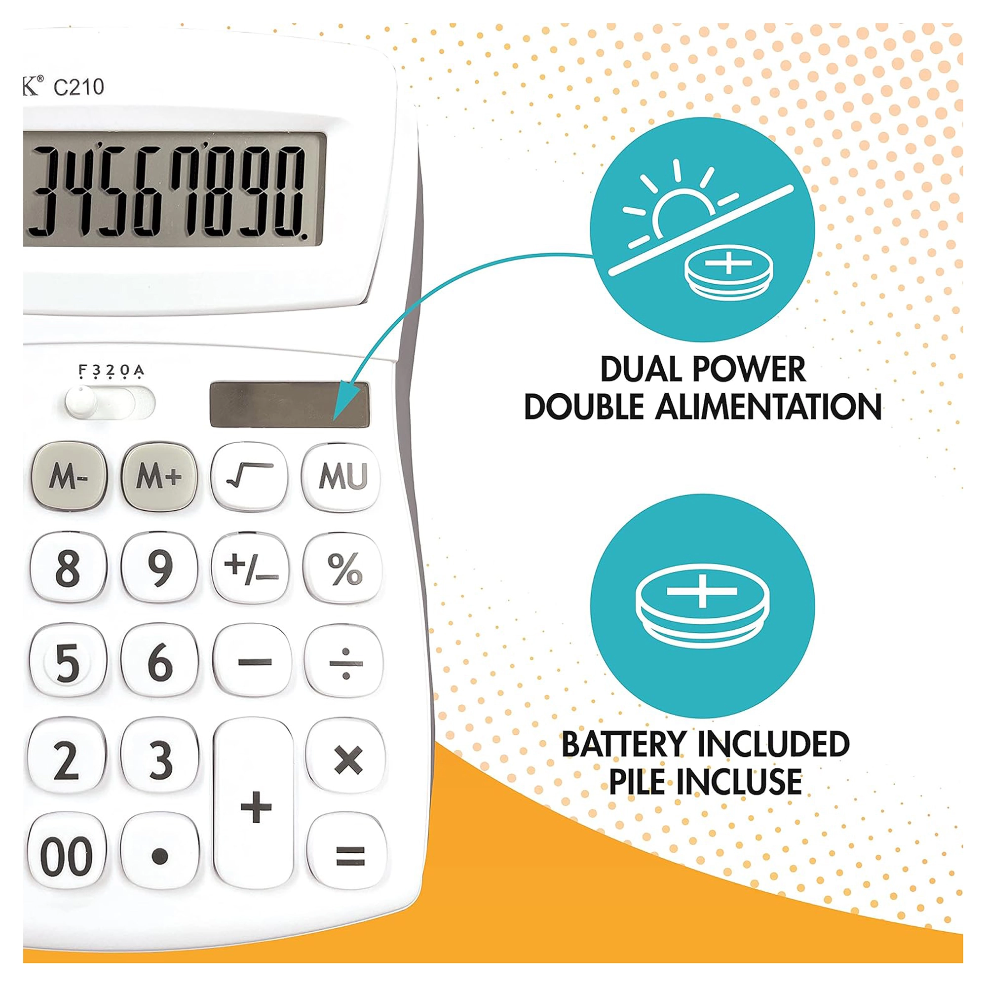 Calculatrice de bureau polyvalente avec écran rabattable 10 chiffres, grandes touches caoutchoutées et double alimentation (solaire + pile AG10). Elle offre des fonctions de base et avancées incluant mémoire pour 3 nombres, pourcentages, racine carrée, calcul de marge et touche de correction. Idéale pour le bureau, l’école et la maison.