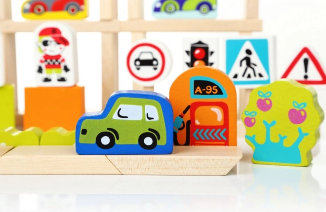 Le kit de transport dans la ville captivera les enfants grâce à sa combinaison de blocs en bois colorés, qu'ils peuvent assembler en une ville animée pleine de voitures, de feux de circulation et de stations-service. Excellent pour développer les compétences sensorimotrices, la pensée créative et les capacités logiques.