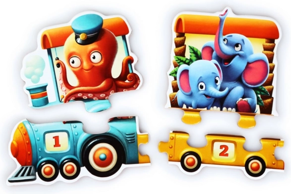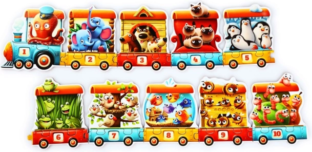 Ce puzzle éducatif coloré est conçu pour un apprentissage joyeux par le jeu. Chaque wagon est formé d’une paire de pièces : sur l’une, une illustration d’un groupe d’animaux ; sur l’autre, le chiffre correspondant. Les enfants comprennent ainsi facilement le principe d’association et l’ordre des nombres successifs.