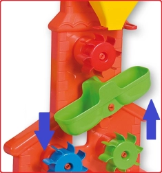 Observez les roues colorées se mettre à tourner et la rigole diviser le flux. Le jeu stimule la perception sensorielle et la pensée logique.