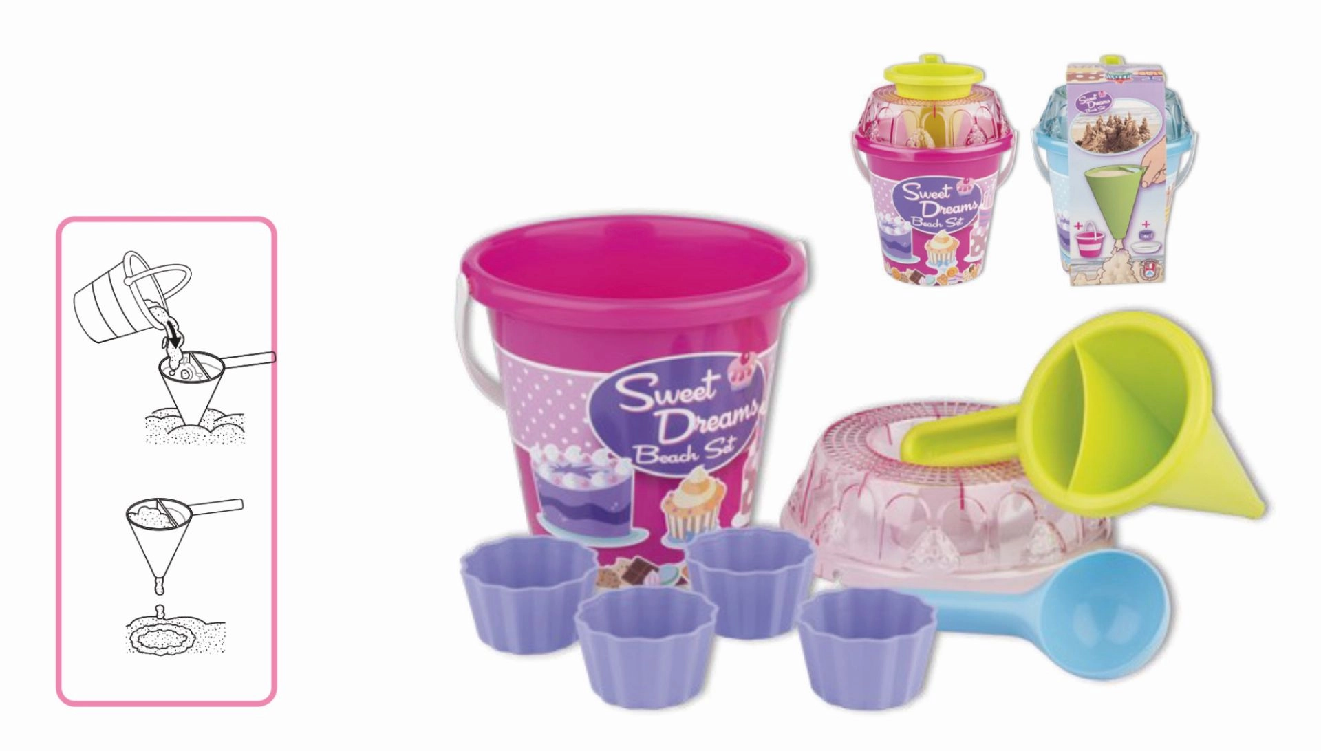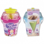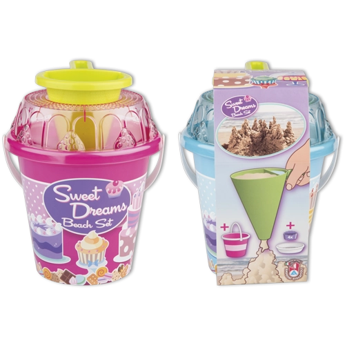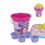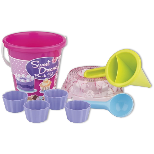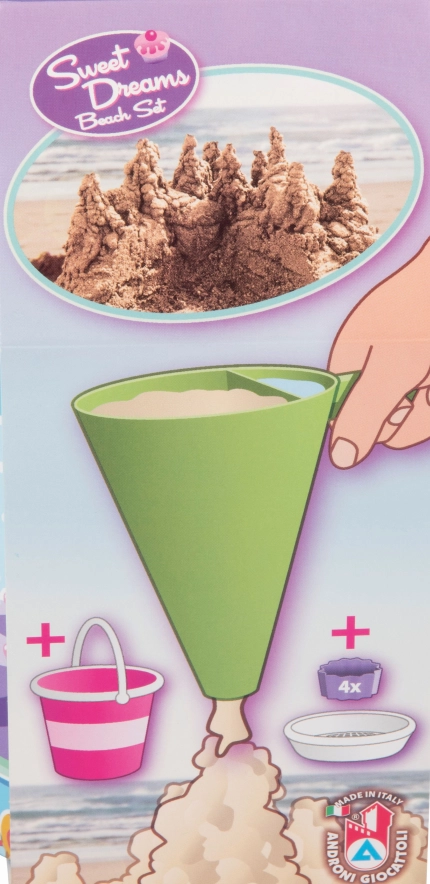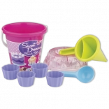 Ensemble de sable en 8 pièces, fabriqué en plastique de haute qualité en Italie. Contient: Seau, tamis transparent en forme de gâteau, pelle, 4 moules en forme de babka et un entonnoir de décoration pour mélanger le sable et l'eau et créer des muffins créatifs et d'autres créations. Seau: diamètre 17 cm, hauteur 16 cm. Ensemble: hauteur 22,5 cm, poids 0,43 kg. Âge recommandé à partir de 12 mois.