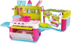 Cette cuisine de comptoir est idéale en voyage comme dans les petites chambres d’enfants. Grâce à deux plateaux latéraux porteurs et amovibles, elle offre plus d’espace de jeu tout en restant facile à transporter. Elle comprend un four avec plaque, une plaque de cuisson, un évier avec robinet et un riche set de vaisselle – tout pour un jeu de cuisine réaliste.
