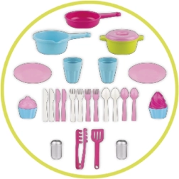 - Contenu de l’emballage : set de couverts pour 4 enfants, tiroir à couverts, four avec plaque, plaque de cuisson, évier avec robinet, 3 casseroles, 2 verres, 2 assiettes, 2 pinces, salière, poivrière et 2 cupcakes