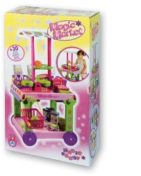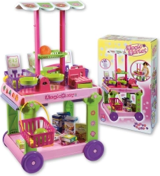 - Chariot mobile avec auvent amovible, comptoir latéral extensible, 4 paniers avec poignée, caisse avec pièces, balance avec plateaux, 12 pcs de fruits et légumes, 8 boîtes de produits