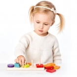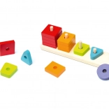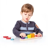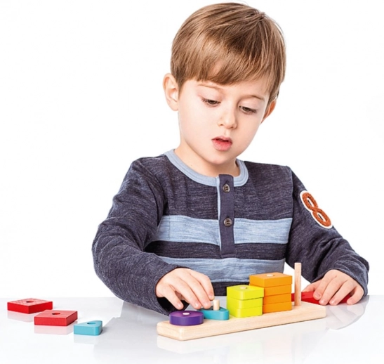 Enfiler les formes sur les chevilles favorise la coordination œil-main, la patience et la concentration, une activité idéale dès 18 mois.