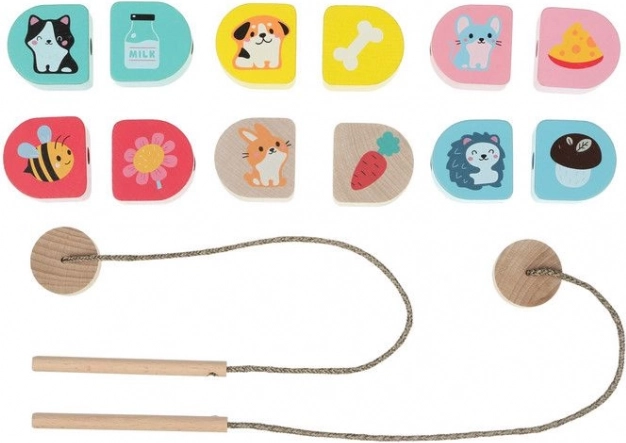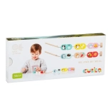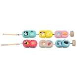 12 éléments d’enfilage en bois (6 paires), 2 cordelettes avec petit bâtonnet en bois et butée