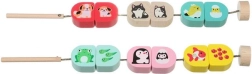 L’enfilage des pièces en bois est facilité par le petit bâtonnet fixé à la ficelle. Les enfants exercent la préhension, la précision et la patience en assemblant les paires d’animaux.