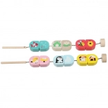 L’enfilage sur un cordon doté d’un petit bâtonnet en bois renforce les doigts, la coordination œil-main et la patience. Excellente préparation à l’écriture.