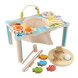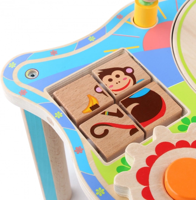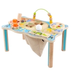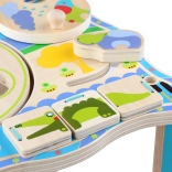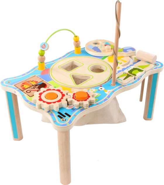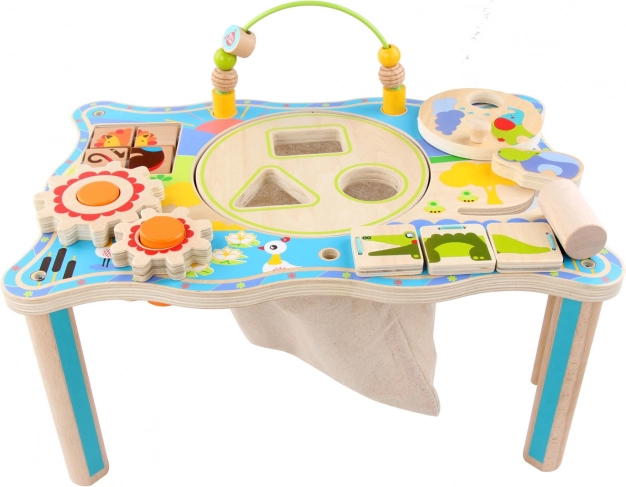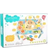 La table en bois aux motifs de jungle allie jeu et apprentissage et favorise la motricité fine, la coordination œil-main et la pensée logique. Les enfants peuvent faire tourner des engrenages, faire glisser des perles le long d’un rail, entraîner force et concentration avec le banc à marteler et s’exercer à la reconnaissance des formes grâce à la boîte d’encastrement. Au centre se trouve un sac en lin pour les poissons pêchés et les pièces de jeu, qui maintient la surface de jeu en ordre.