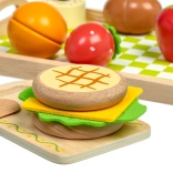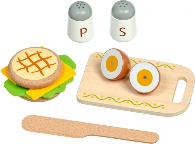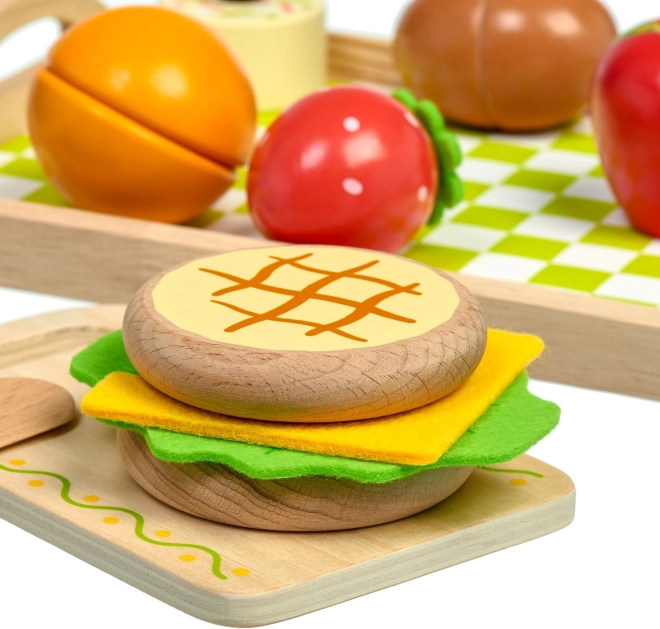 Des composants en bois robustes complétés par des tranches textiles de fromage et de salade. Conception durable et couleurs intenses pour un amusement long et sûr.
