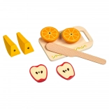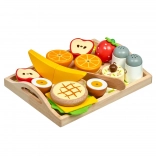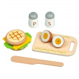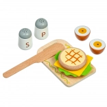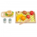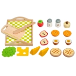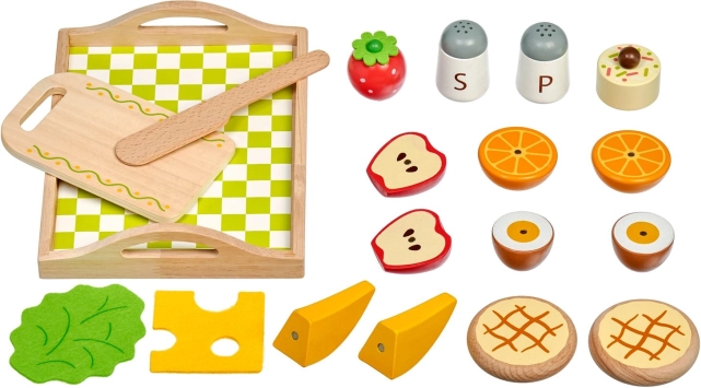 Le set comprend tout pour les petits chefs : un plateau à motif à carreaux, une planche, un couteau, une salière et une poivrière, ainsi qu’un large choix d’aliments – pain, fromage et salade, œuf, banane, pomme, orange, fraise et petit gâteau. L’accent mis sur les matériaux de qualité et la conception durable garantit une longue durée de vie et un jeu en toute sécurité.