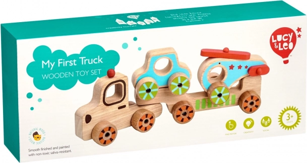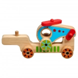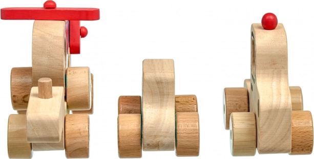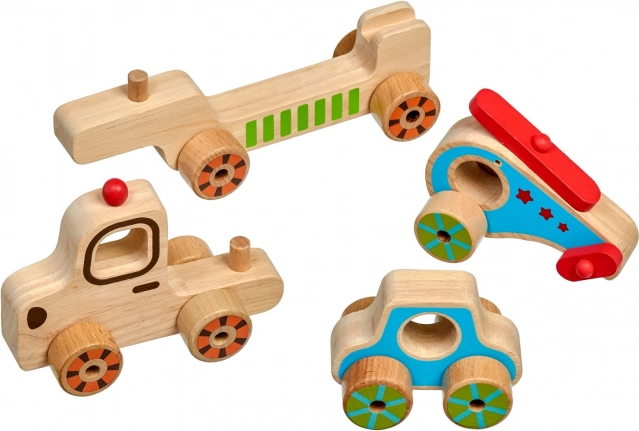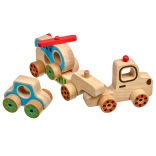 Le camion, la petite voiture et l’hélicoptère peuvent être utilisés séparément ou assemblés en un seul convoi. Les enfants exercent leur imagination et leur logique en chargeant et en transportant.