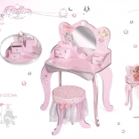 Elle offre deux tiroirs pour ranger les accessoires et un miroir, facilitant le jeu d'habillage.