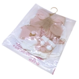 Comprend une robe, un bonnet, un bandeau, des chaussettes et une écharpe, qui peuvent être combinés à volonté.