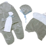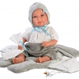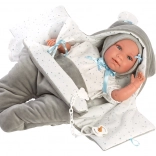 Tenue 2 pièces pour poupée bébé incluant une couverture d’emmaillotage rapide pour siège auto et un mouchoir décoratif. Idéale pour les poupées de taille 40-42 cm.