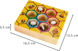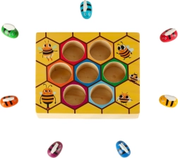 Jeu éducatif Nids d'abeilles Montessori soutient le développement des compétences motrices et l'autonomie des enfants. Il comprend une base en bois massif et sept abeilles colorées que les enfants placent dans les trous appropriés à l'aide d'une pince en plastique rouge fournie.