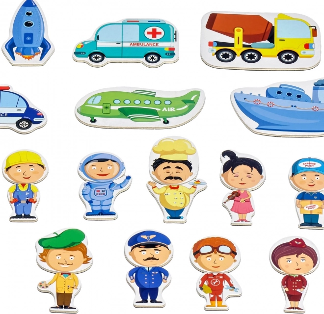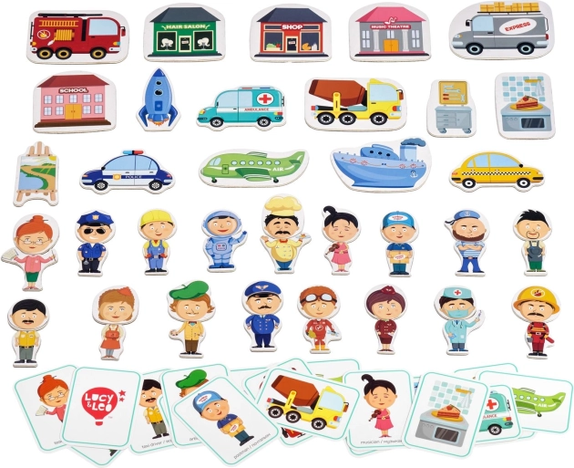Ce set magnétique créatif présente de manière ludique le monde des métiers – du pompier et du policier jusqu’au cuisinier ou au pilote. Grâce aux cartes recto verso, les enfants peuvent assembler les bonnes combinaisons ou créer leurs propres personnages et scènes. La valisette en bois avec tableau magnétique assure un rangement pratique de toutes les pièces et un transport facile en voyage.